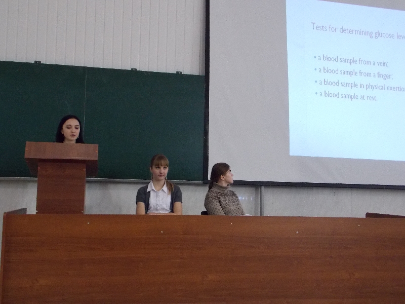 19 декабря 2012 года состоялась конференция-презентация «Medical and Social Issues/ Медицинские и социальные проблемы», подготовленная студентами-медиками I и III курсов. В конференции приняли участие 12 человек – студенты групп 10ЛК1, 10ЛК2 и 12ЛК1. Будущие кибернетики представили на английском языке доклады-презентации по актуальным проблемам современной медицины и общества: «Диагностирование заболеваний: МРТ», «Роль витаминов в организме человека», «Стресс в жизни человека», «Ранняя диагностика повышенного сахара в крови», «Современные методы контрацепции» и др. Информационную ценность и интересную подачу сообщений смогли оценить однокурсники выступающих, а также преподаватели кафедры «Английский язык»: ст. преп. Данкова Н.С., к. п. н., доцент Головушкина М.В., к. п. н., доцент Иващенко И.А..