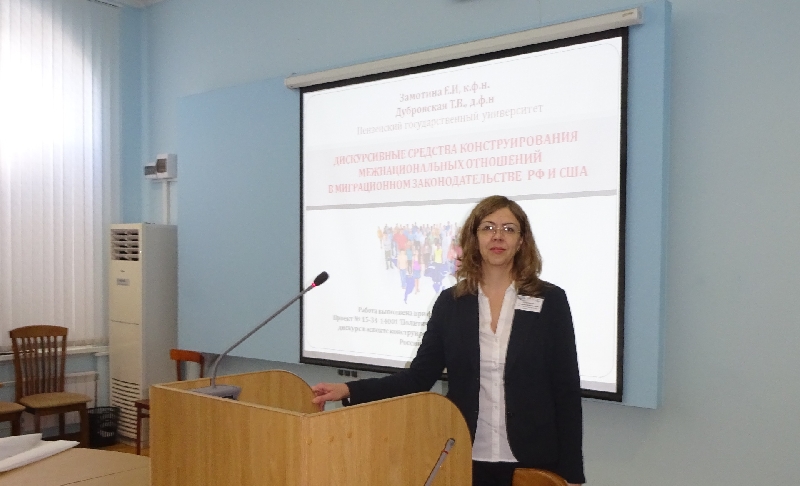 IV Международной научно-практической конференции «Язык. Право. Общество». Заведующая кафедрой д.ф.н. Т.В. Дубровская возглавила работу секции «Язык и правовая коммуникация. Проблемы перевода юридических текстов. Юридический дискурс как культурный феномен». В рамках реализации гранта № 15-34-14001 «Политический, юридический и масс-медийный дискурс в аспекте конструирования межнациональных отношений Российской Федерации» Т.В. Дубровская и доцент,к.ф.н. Е.И. Замотина представили доклад «Дискурсивные средства конструирования межнациональных отношений в миграционном законодательстве РФ и США». В секции «Язык и политика. Речевые манипуляции в СМИ: лингво-правовые аспекты» прозвучали выступления аспирантов кафедры Н.С. Данковой и Я.А. Ярославцевой. Доклад старшего преподавателя кафедры АЯ Н.С. Данковой «Топос доверия/недоверия как средство репрезентации отношений “судебная власть – народ” в дискурсе СМИ (на материале российских и английских газет)» отражал результаты диссертационного исследования. Я.А. Ярославцева, ассистент кафедры английского языка факультета иностранных языков Ульяновский государственный университет им. И.Н. Ульянова также представила свои диссертационные наработки по теме «Репрезентация социальных акторов во внешнеполитическом дискурсе». Доцент кафедры, к.п.н. М.В. Головушкина выступила с докладом на тему «Английская система судопроизводства в произведениях Чарльза Диккенса. Современный взгляд» в секции «Роль художественной литературы в формировании правовой культуры общества».