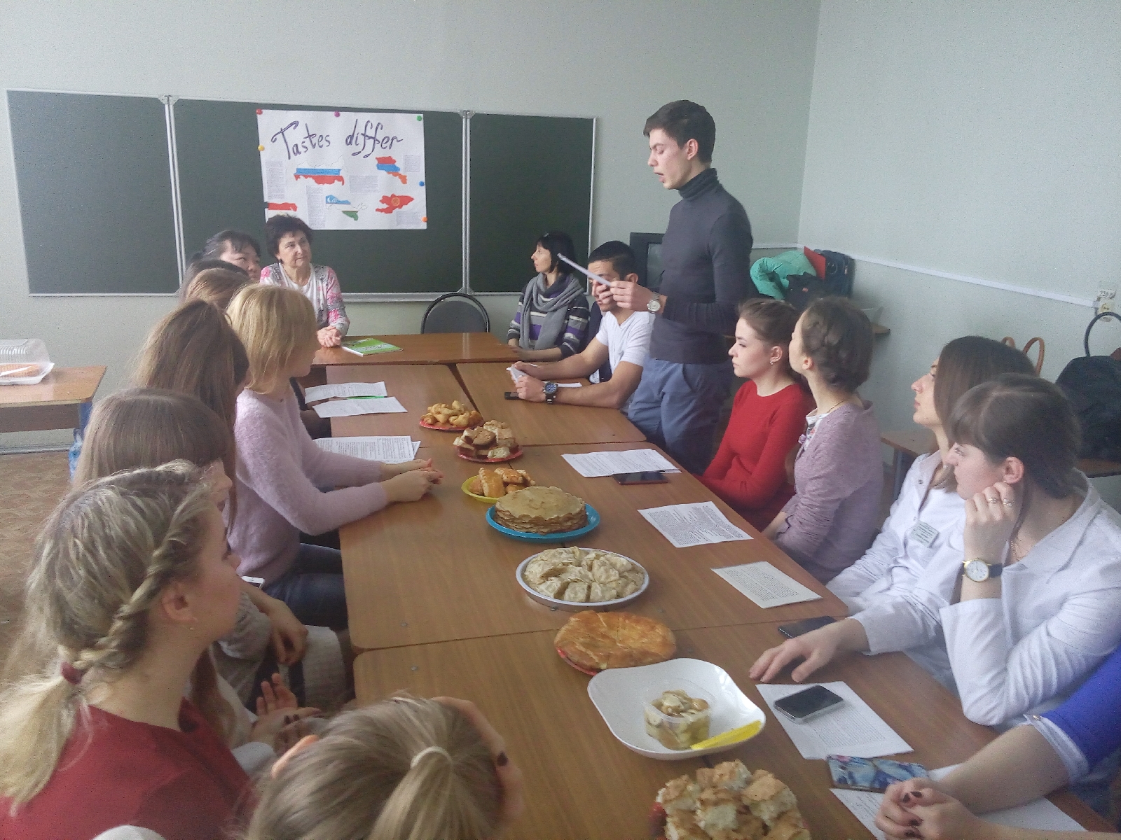 10.03.2017г. на кафедре «Английский язык» было проведено занятие в формате проектной работы по теме “Cuisine as a part of national culture”. В мероприятии приняли участие студенты медицинского института, группы: 15ЛФ-1 и 15ЛФ-2. Организаторами мероприятия выступили: доцент, кандидат педагогических наук Дронова О.В. и старший преподаватель Антропова Н.В. Студенты из разных стран: Армения, Нигерия, Египет, Казахстан, Узбекистан, Туркменистан, Россия сделали презентацию своих докладов о традициях национальной кухни на английском языке. Кроме того, у студентов была возможность попробовать блюда национальной кухни.