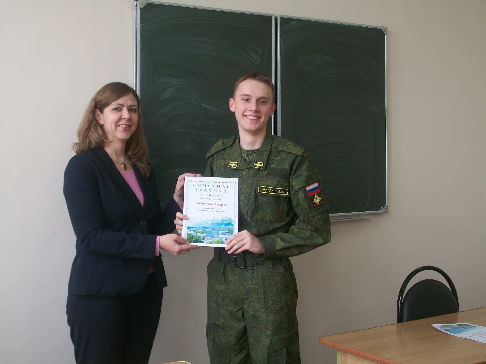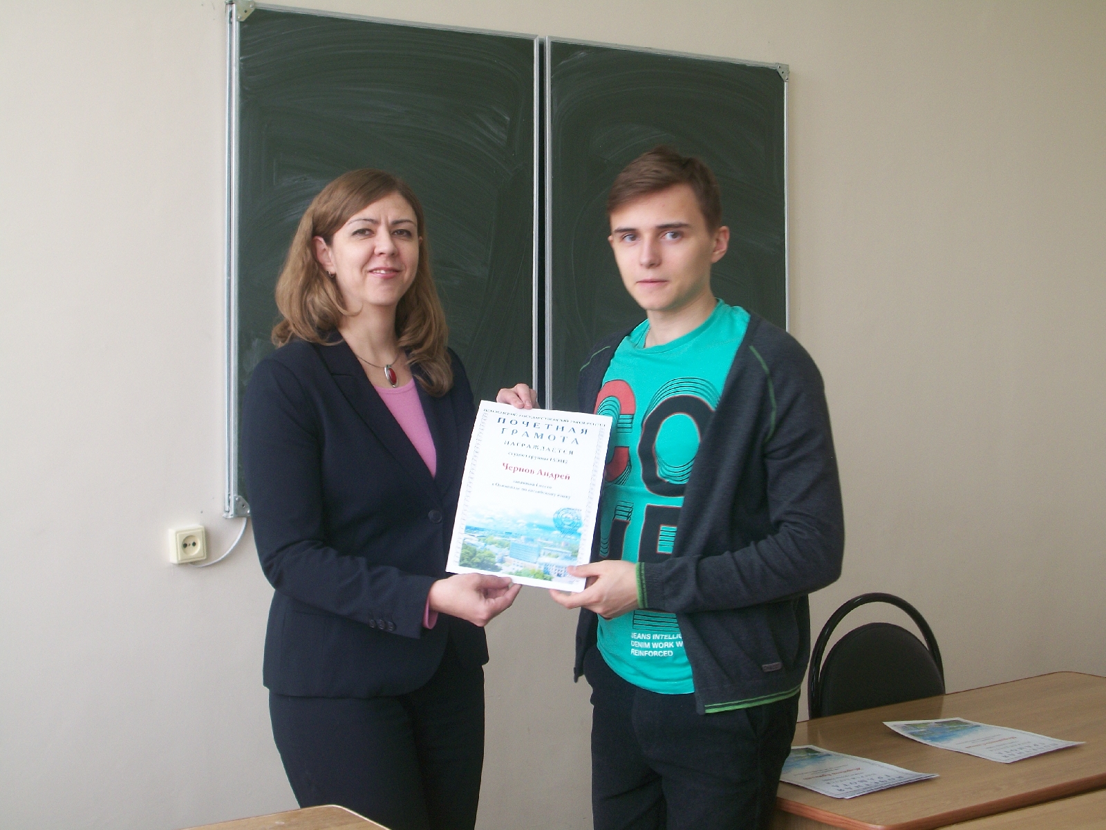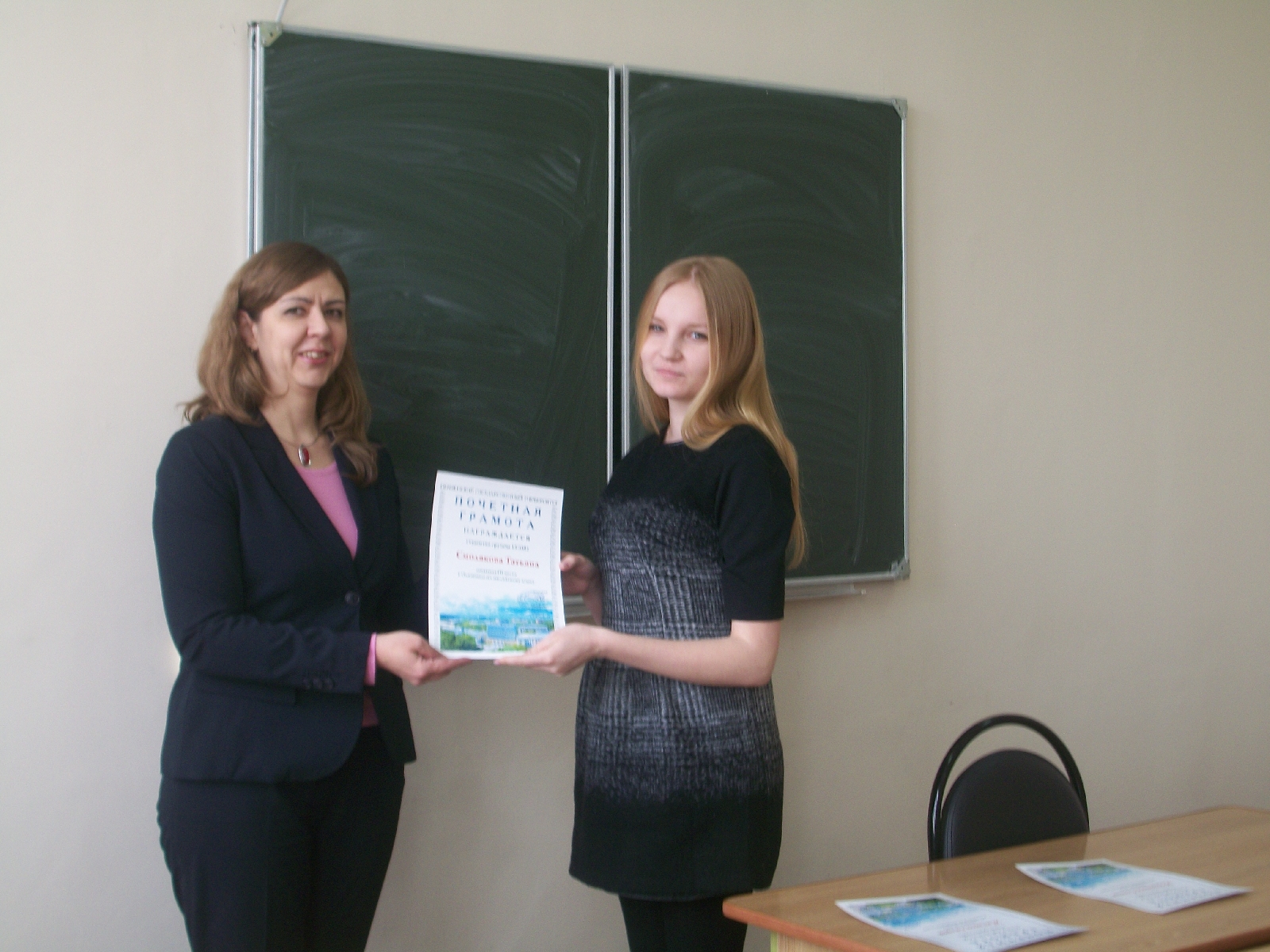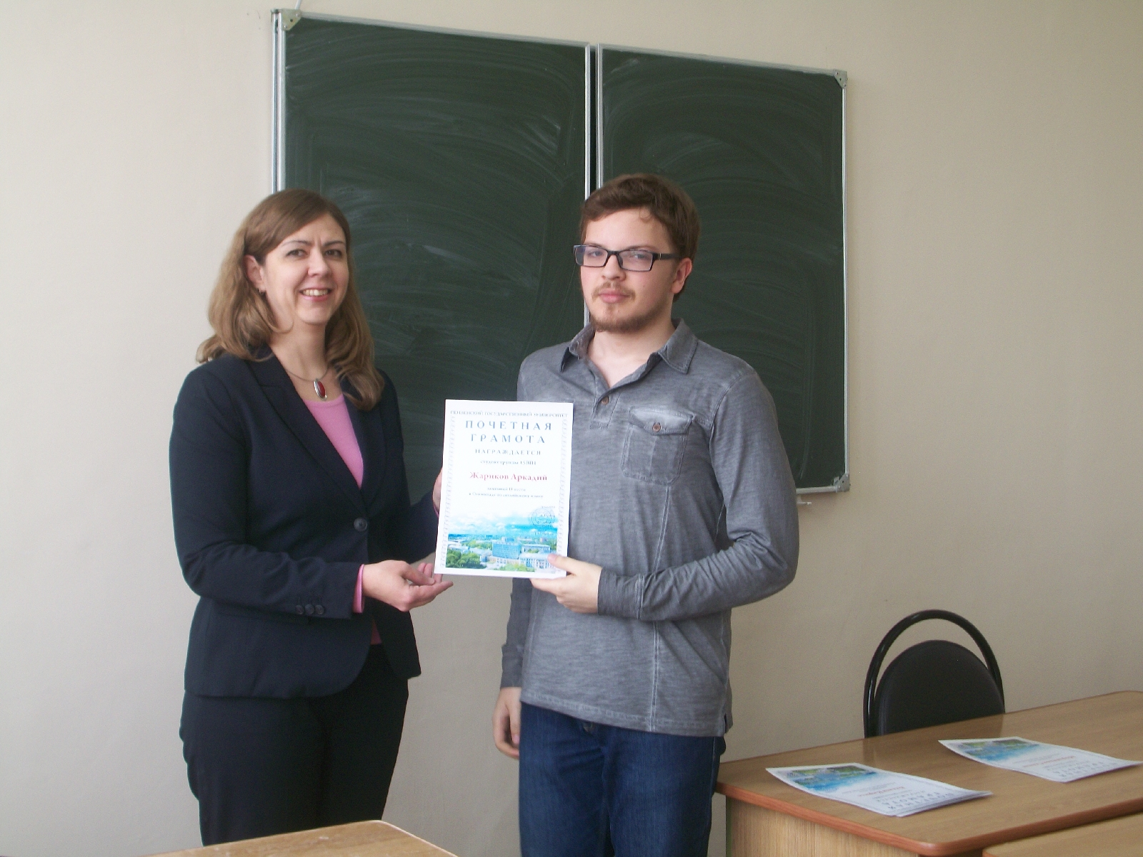 21.03.17 на кафедре «Английский язык» состоялось торжественное вручение грамот победителям ежегодной олимпиады по английскому языку. На вручении присутствовали организаторы мероприятия доцент, к.п.н. Миханова О.П., старший преподаватель Юрасова О.Н. и заведующая кафедрой «Английский язык» д.ф.н., доцент Дубровская Т.В. Татьяна Викторовна поблагодарила студентов за отличную работу и проявленный интерес к олимпиаде. Она поздравила победителей олимпиады с отличными результатами и пожелала им дальнейших успехов в изучении английского языка и в других сферах студенческой деятельности.