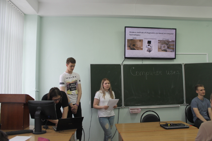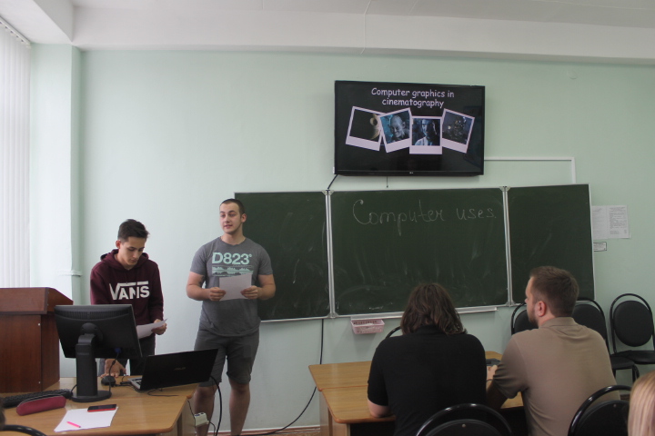 24.05.2018 студенты ФВТ представили презентации на тему «Computer uses». Данный вид работы проводился в рамках профессионально-ориентированного подхода к обучению. Наиболее активное участие в мероприятии приняли учащиеся групп 17ВВ1, 17ВВ2, 17ВП1, 17ВЭ1. Под руководством преподавателей кафедры «Английский язык» О.Н. Юрасовой и Н.С. Данковой ребята подготовили презентации о роли компьютера в таких сферах деятельности, как образование, производство, бизнес, банковское дело, медицина, кинематограф, транспорт.