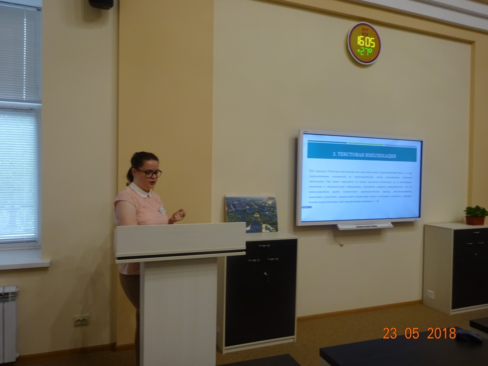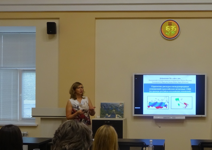 23 мая в Пензенском государственном университете начала работу V научно-практическая конференция «Язык. Право. Общество». Три сотрудника кафедры – зав. кафедрой Т.В. Дубровская, ст. преподаватель Н.С. Данкова, преподаватель Н.Ю. Видинеева – приняли участие в работе секции «Язык и политика. Речевые манипуляции в СМИ: лингвоправовые аспекты». Т.В. Дубровская представила доклад на тему «Стратегии дискурса международных отношений в российских печатных СМИ (на примере российско-итальянских отношений)», Н.С. Данкова выступила с докладом «Топос справедливости / несправедливости как средство репрезентации судебной власти в дискурсе СМИ (на материале российских и английских газет)», Н.Ю. Видинеева представила доклад на тему «Имплицитные языковые средства конструирования национальной идентичности в медиадискурсе».