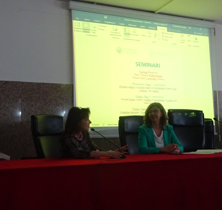 Находясь в качестве приглашенного профессора в Университете Бари им. Альдо Моро (Италия), зав. кафедрой «Английский язык» д. филол. наук Т.В. Дубровская 2 мая провела публичную лекцию для студентов и преподавателей факультета политологии, посвященную применению дискурс-анализа в политологии и международных отношениях. Теоретические положения были проиллюстрированы современными примерами речевого материала, который охватывал сферу российско-итальянских международных отношений. Лекция вызвала интерес, комментарии и вопросы со стороны аудитории.