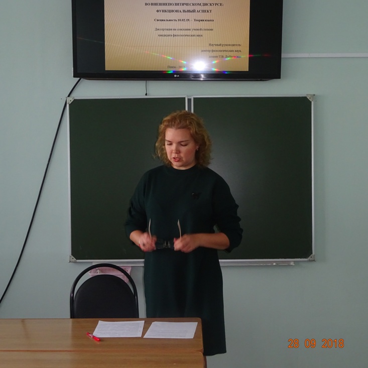 28 сентября 2018г. на кафедре «Английский язык» состоялось заседание кафедры для предварительного обсуждения (предзащиты) диссертации на соискание учёной степени кандидата филологических наук Блохиной Я.А. «Семантическая оппозиция «сила VS слабость» во внешнеполитическом дискурсе: функциональный аспект» ( научный руководитель д.ф.н., доцент Дубровская Т.В.)