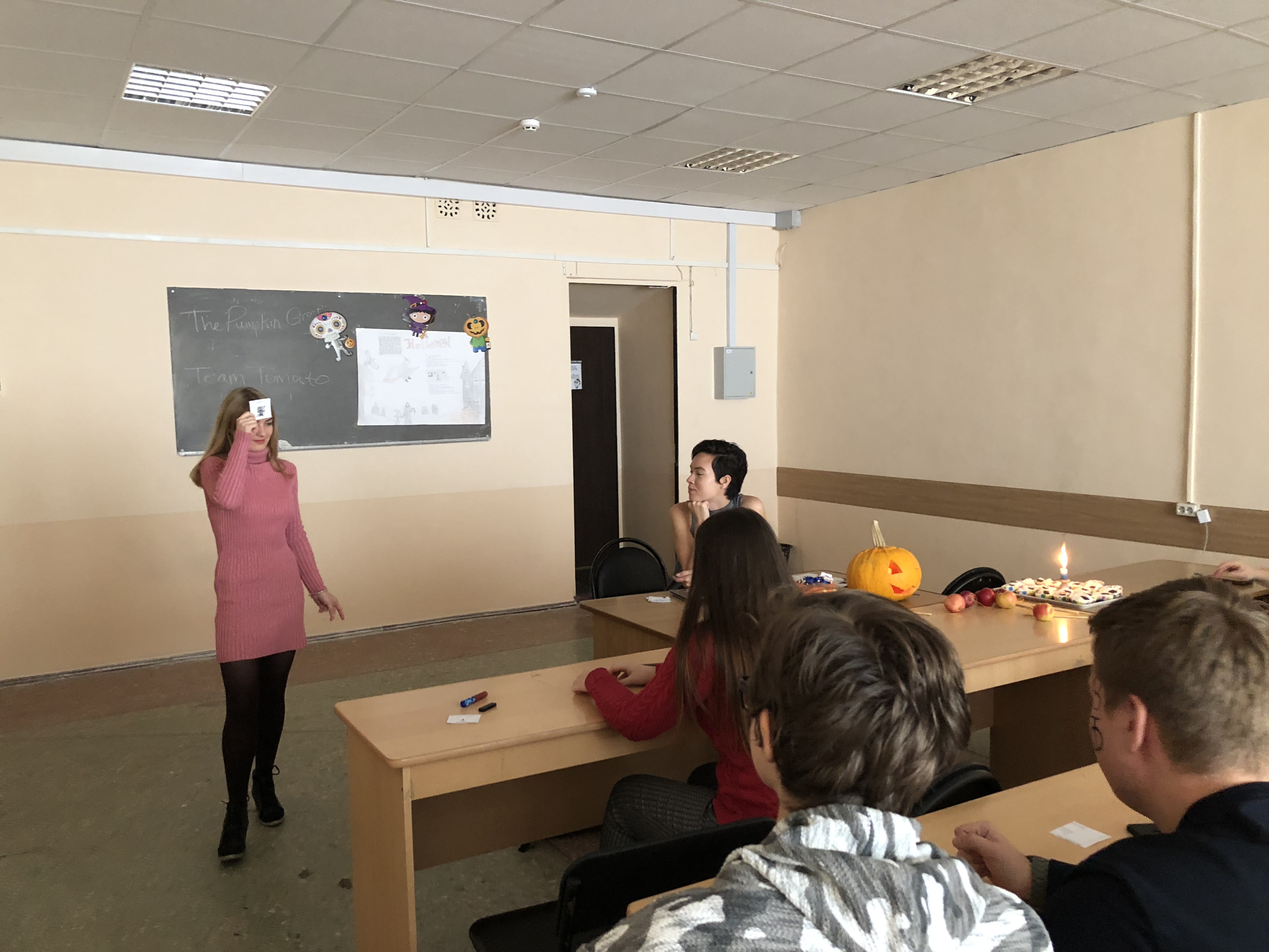 Александра Фэй познакомила ребят с историей праздника, рассказала о том, как весело и оригинально отмечают Halloween в Америке. Затем настал черед конкурсов. Ребята разделились на 2 команды – “The Pumpkin Group” и “Team Tomato”. Первый конкурс назывался “Guess who I am”. Участник, не глядя, вытягивал карточку с хэллоуинским персонажем и, задавая наводящие вопросы, должен был угадать, кто изображен на карточке. Все участники справились с заданием блестяще. Следующий конкурс назывался “Apple Bobbing”. Это традиционная забава на Halloween. Задача участников – укусить без помощи рук яблоко, висящее на веревке. И снова команды отлично справились! Также командам было предложено послушать классическую песню на Halloween – “Monster Mash” и вставить пропущенные слова. С этим заданием ребятам пришлось потрудиться, но с помощью Александры Фэй все загадки были разгаданы!