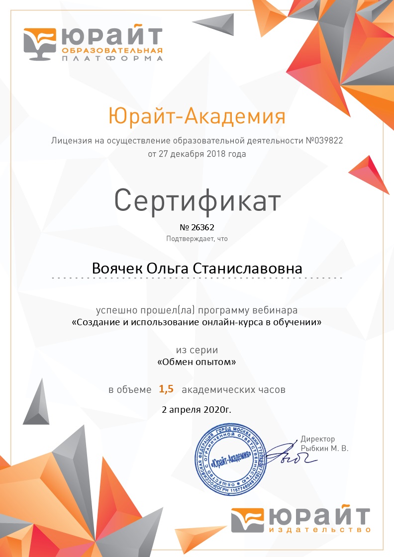 02 апреля 2020 года старший преподаватель кафедры «Английский язык» Воячек О.С. и доцент кафедры «Английский язык» Головушкина М.В. приняли участие в вебинаре «Создание и использование онлайн курса в обучении» на базе образовательной платформы «ЮРАЙТ». По результатам успешного освоения программы вебинара были получены сертификаты.