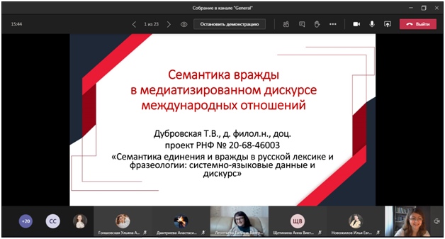 4 ноября состоялась публичная онлайн лекция зав. кафедрой «Английский язык», д.ф.н. Т.В. Дубровской в Уральском Федеральном университете имени первого Президента России Б.Н. Ельцина. Татьяна Викторовна выступила перед студентами специальности «Реклама и связи с общественностью» по проблеме языка вражды. Лекция подготовлена в рамках научного проекта РНФ №20-68-46003 «Семантика единения и вражды в русской лексике и фразеологии: системно-языковые данные и дискурс», который реализуется в Уральском Федеральном университете имени первого Президента России Б.Н. Ельцина под руководством д.ф.н. Т.В. Леонтьевой. Т.В. Дубровская принимает участие в проекте в качестве ведущего ученого.