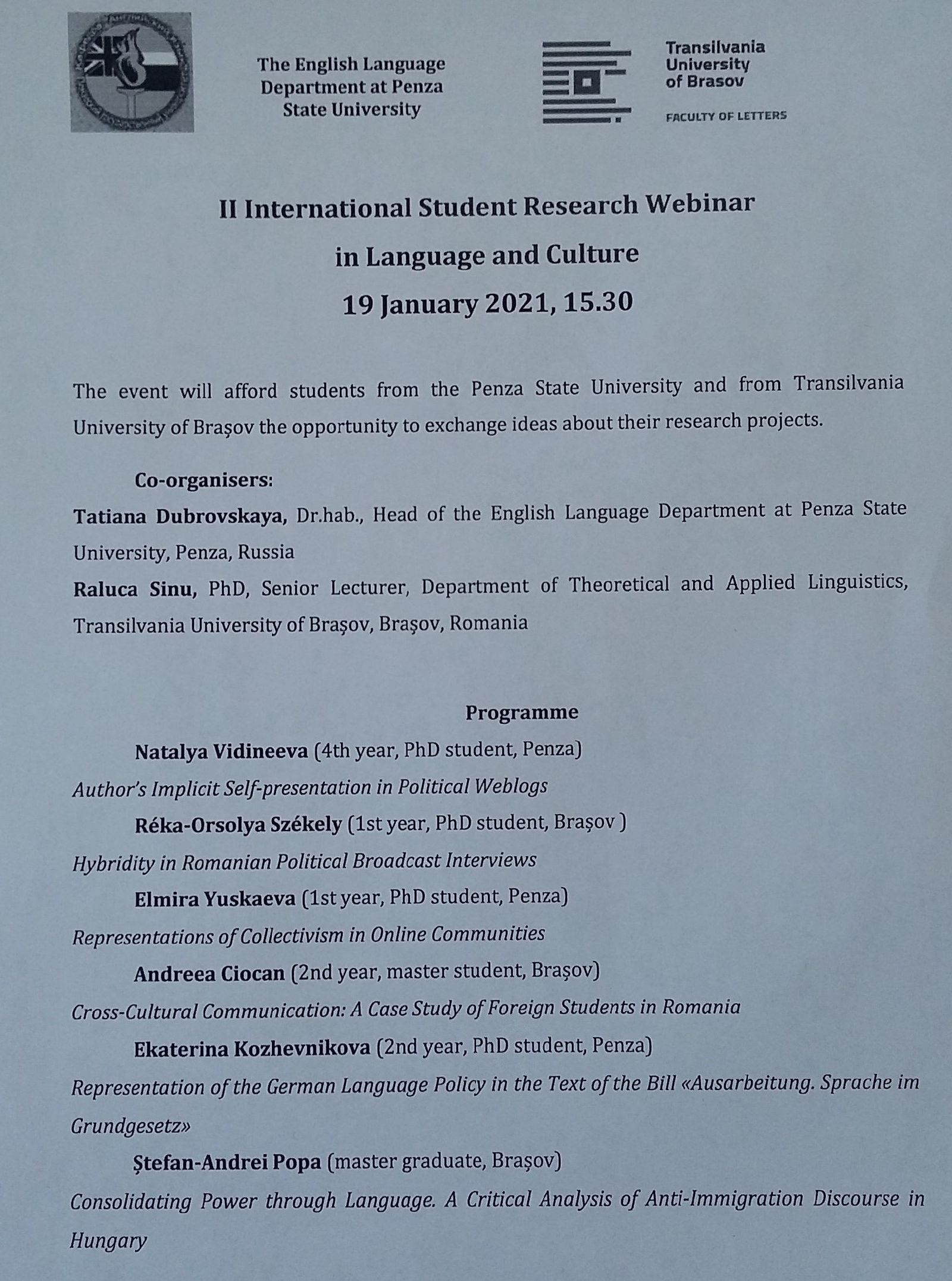 19 января 2021 года на кафедре «Английский язык» состоялся II Международный студенческий исследовательский вебинар по языку и культуре (II International Student Research Webinar in Language and Culture), проведенный совместно с Трансильванским университетом г. Брашов (Румыния). Проведение вебинара было организовано заведующей кафедрой «Английский язык» д.ф.н. Т.В. Дубровской и Ралукой Сину, PhD, доцентом кафедры теоретической и прикладной лингвистики Трансильванского университета.