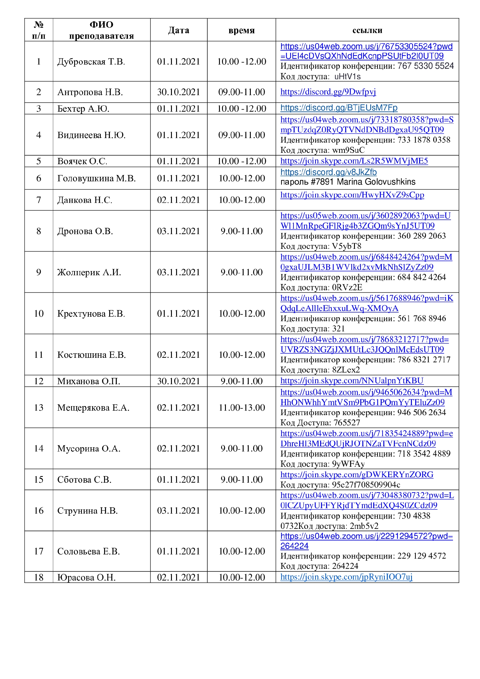 График консультаций в период с 30.10.2021 по 07.11.2021