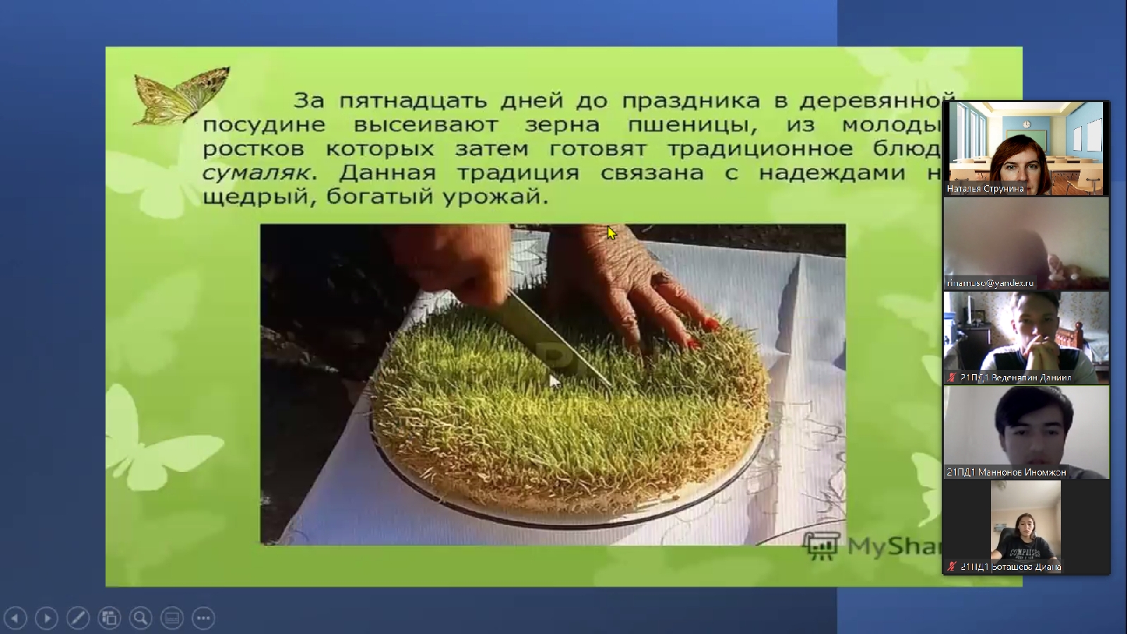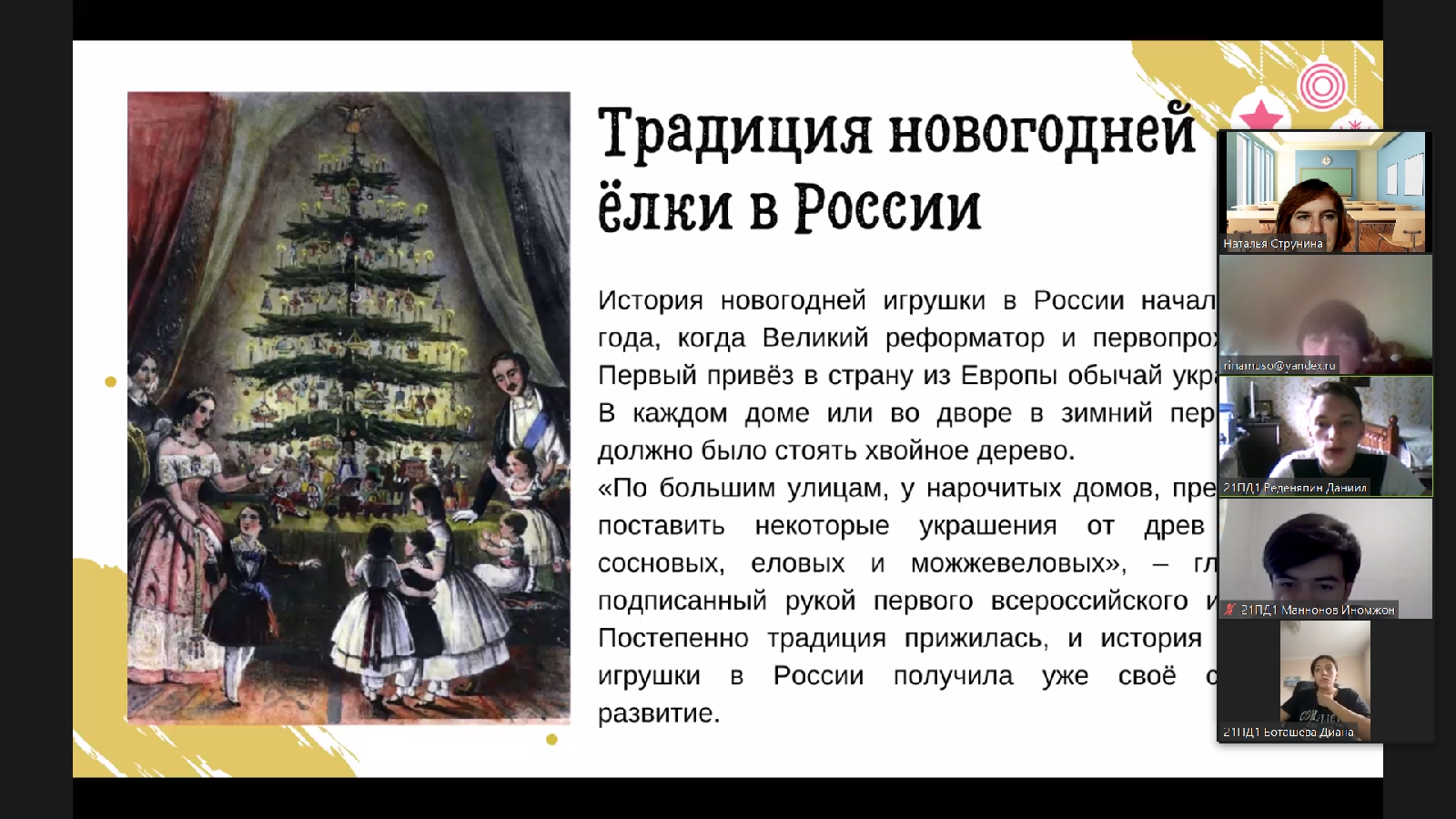 13 декабря 2021 г. на кафедре «Английский язык» состоялось ежегодное мероприятие для иностранных студентов, посвященное празднованию Нового года в России – «Новогодний калейдоскоп: обычаи и традиции русских новогодних праздников». Мероприятие подготовили и провели О.А. Мусорина и Н.В. Струнина в группе 21 ПД1. Встреча проходила в дистанционном формате, на платформе Zoom. И. Маннонов, студент из Таджикистана, подготовил презентацию о Наврузе – празднике начала нового года у некоторых азиатских народов. Ребята узнали об истории праздника Навруз, о традиционных праздничных блюдах, о древних обрядах. Праздник традиционно отмечают 21 марта, в день весеннего равноденствия. Интересно отметить, что Навруз - настолько древний и самобытный праздник, что по решению ЮНЕСКО он считается нематериальным культурным наследием человечества. Далее Д. Боташева, Д. Веденяпин и М. Ситникова представили увлекательную презентацию о новогодних традициях в России. Ребята рассказали об истории новогодних елочных украшений и провели викторину. Самым активным участником оказался Б. Муканбетов. В завершение мероприятия ребята получили возможность оказаться на Клинской фабрике елочных игрушек «Елочка», познакомиться с работой мастеров-стеклодувов и побывать в Музее фабрики. Пусть экскурсия была виртуальной, но очень интересной и познавательной. Мероприятие позволило студентам узнать много нового о новогодних традициях в разных странах и способствовало повышению мотивации к изучению русского языка как иностранного.