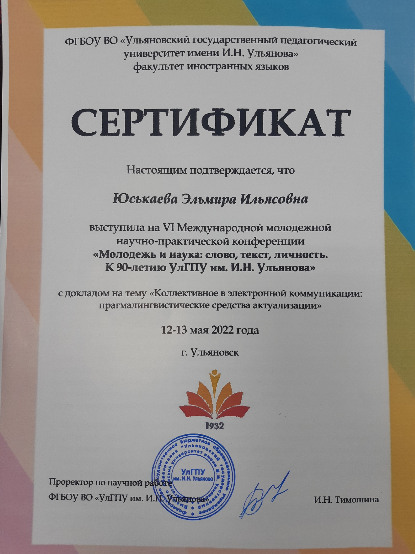 12-13 мая 2022 года на базе факультета иностранных языков Ульяновского государственного педагогического университета им. И.Н. Ульянова в рамках VI Международной молодежной научно-практической конференции «Молодежь и наука: слово, текст, личность. К 90-летнему юбилею УлГПУ им. И.Н. Ульянова» проходил очный этап III Международного конкурса научно-исследовательских работ «Моя интеллект-траектория». Аспирант кафедры «Английский язык» Э. И. Юськаева представила доклад «Коллективное в электронной коммуникации: прагмалингвистические средства актуализации», подготовленный при поддержке гранта Российского научного фонда (проект № 20-68-46003 «Семантика единения и вражды в русской лексике и фразеологии: системно-языковые данные и дискурс»). Победители конкурса будут объявлены после оценки экспертами научных статей конкурсантов в июне 2022 года.