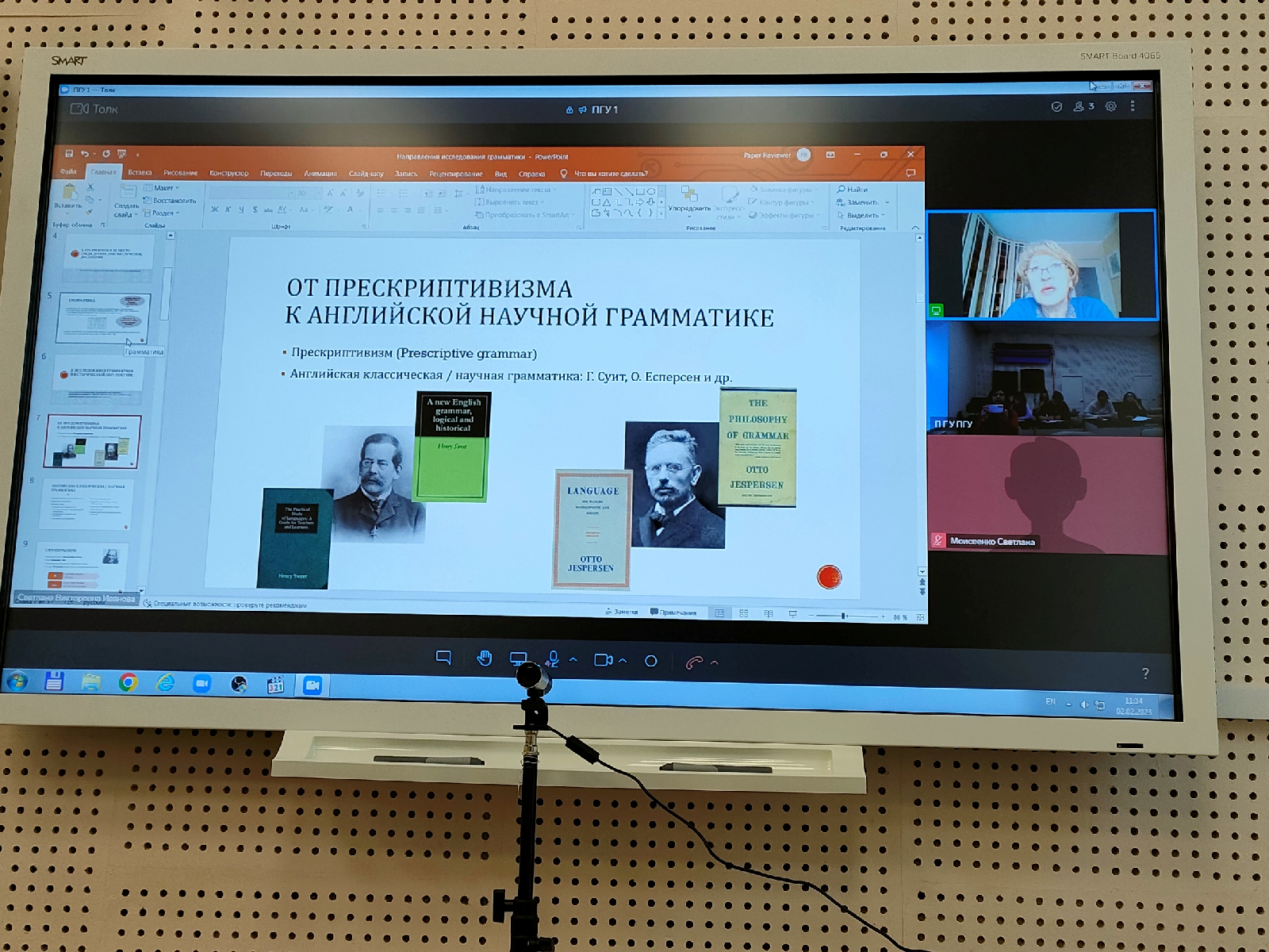Продолжается цикл мероприятий для аспирантов, обучающихся по научной специальности «Теоретическая, прикладная и сравнительно-сопоставительная лингвистика», организованный д.ф.н. Т.В. Дубровской, зав. кафедрой «Английский язык». 2 февраля 2023 г. состоялась онлайн-лекция Светланы Викторовны Ивановой, доктора филологических наук, профессора, заведующего кафедрой романо-германской филологии и лингводидактики Ленинградского государственного университета им. А.С. Пушкина. Профессор С.В. Иванова – специалист в области лингвокультурологии, лингвокогнитологии, дискурс-анализа, политической лингвистики, медиалингвистики, лингвистики текста, американистики, теоретической грамматики, автор многих работ в перечисленных областях. Светлана Викторовна выступила с лекцией «Направления исследований грамматики», в которой представила подходы к грамматическому строю языка в рамках разных лингвистических школ. Обсуждались перспективы развития грамматики как раздела языкознания. Также были затронуты общеконцептуальные аспекты проведения научных исследований: единица анализа, метод, строгость определений, выдержанность научной парадигмы.