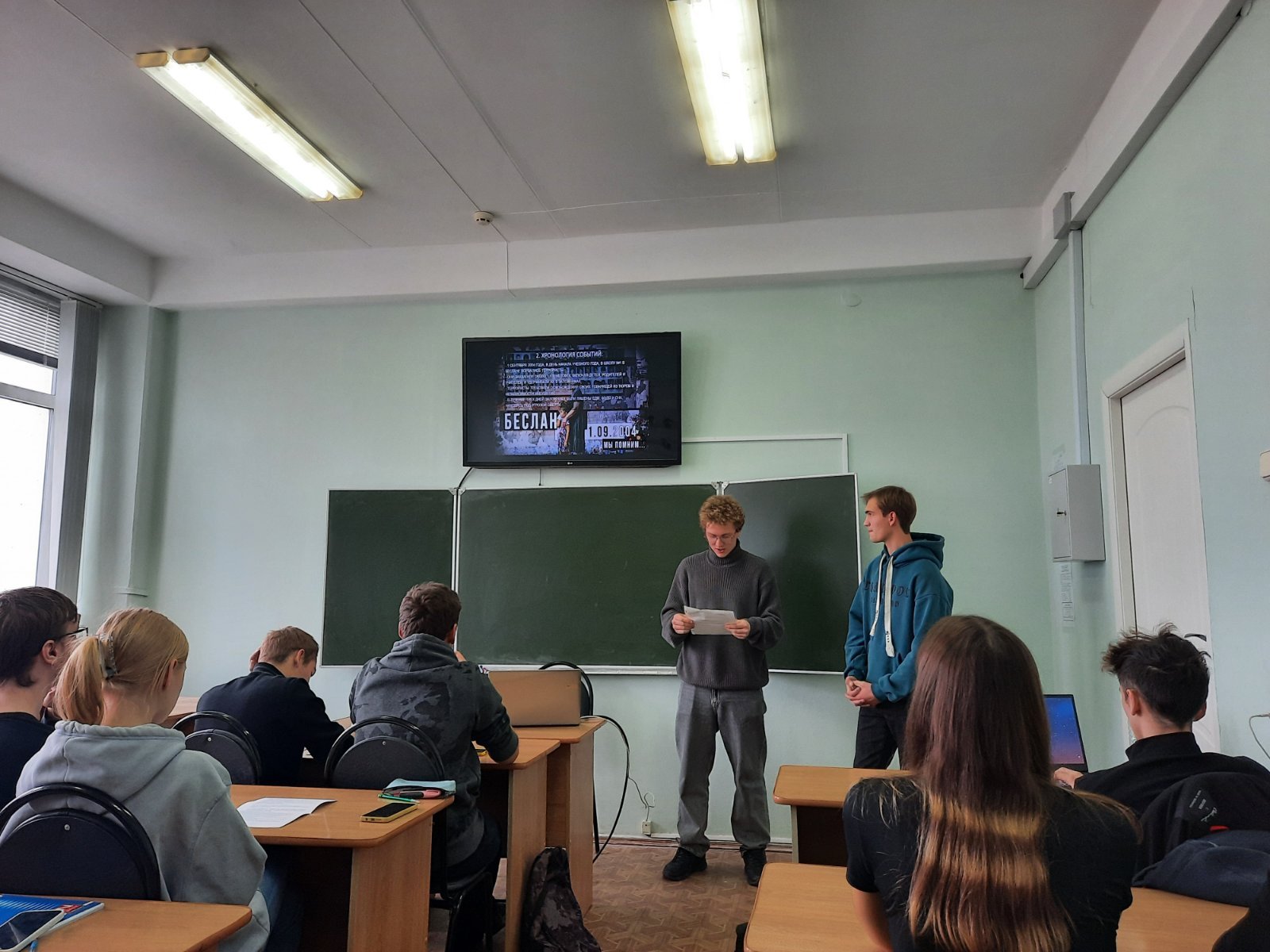 1. Евсеев Егор и Благушин Дмитрий (23ПД1, руководитель Крехтунова Е.В.) рассказали об ужасной трагедии 2004 года, произошедшей в Беслане;