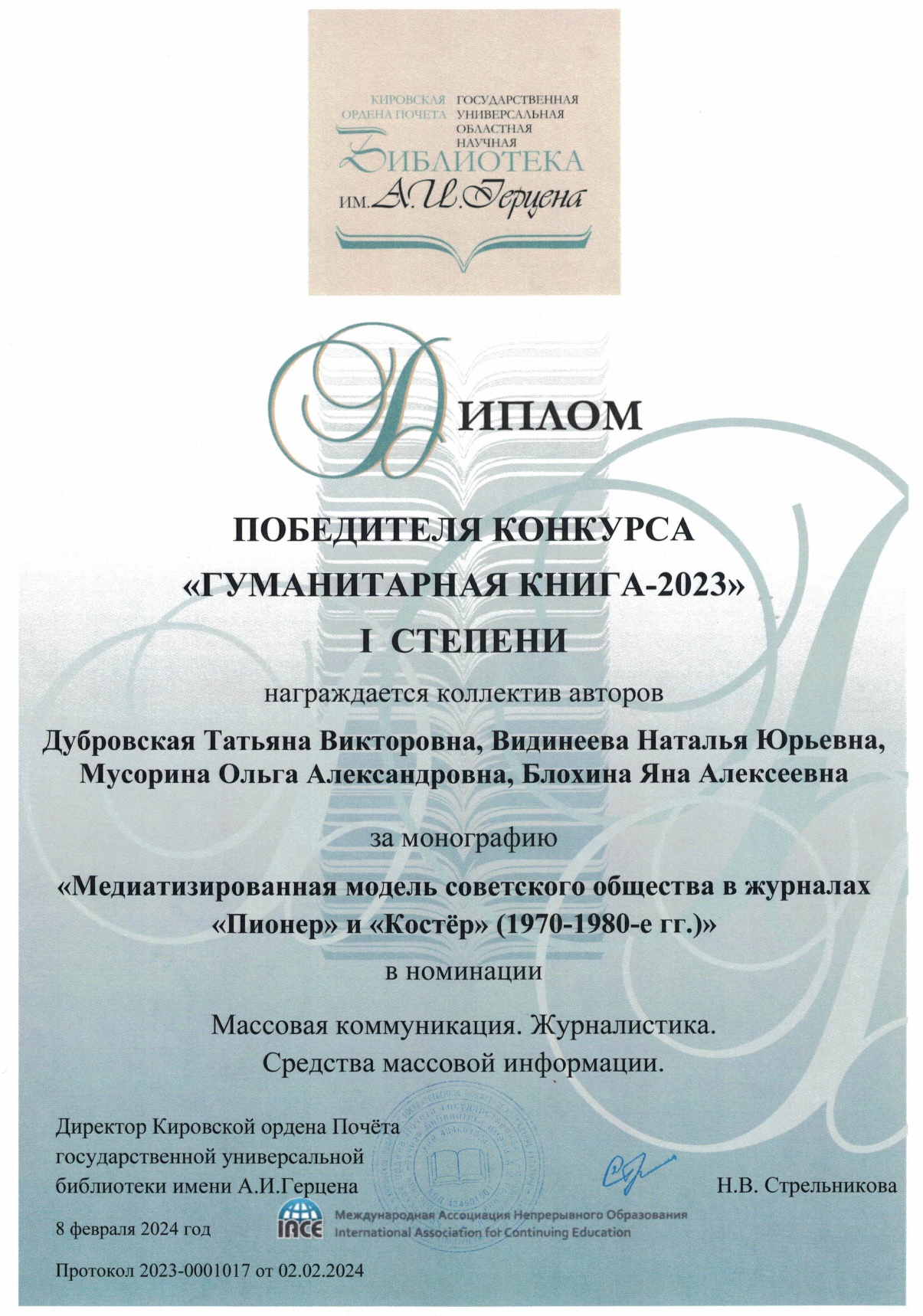 Коллектив авторов в составе зав. кафедрой, профессора Т.В. Дубровской, доцентов О.А. Мусориной и Н.Ю. Видинеевой, исследователя Я.А. Блохиной стал победителем XVI Конкурса среди педагогов образовательных учреждений среднего профессионального и высшего профессионального образования, аспирантов и соискателей Приволжского Федерального округа «Гуманитарная книга – 2023». Данный конкурс ежегодно проводится Кировской государственной универсальной областной научной библиотекой им. А.И. Герцена. Исследователи получили Диплом I степени в номинации «Массовая коммуникация. Журналистика. Средства массовой информации» за монографию «Медиатизированная модель советского общества в журналах «Пионер» и «Костёр» (1970-1980 е. гг.)». Монография издана в рамках реализации гранта Российского научного фонда № 22-28-00775, проект «Медиатизированная модель советского общества в детской периодике», https://rscf.ru/project/22-28-00775/ .