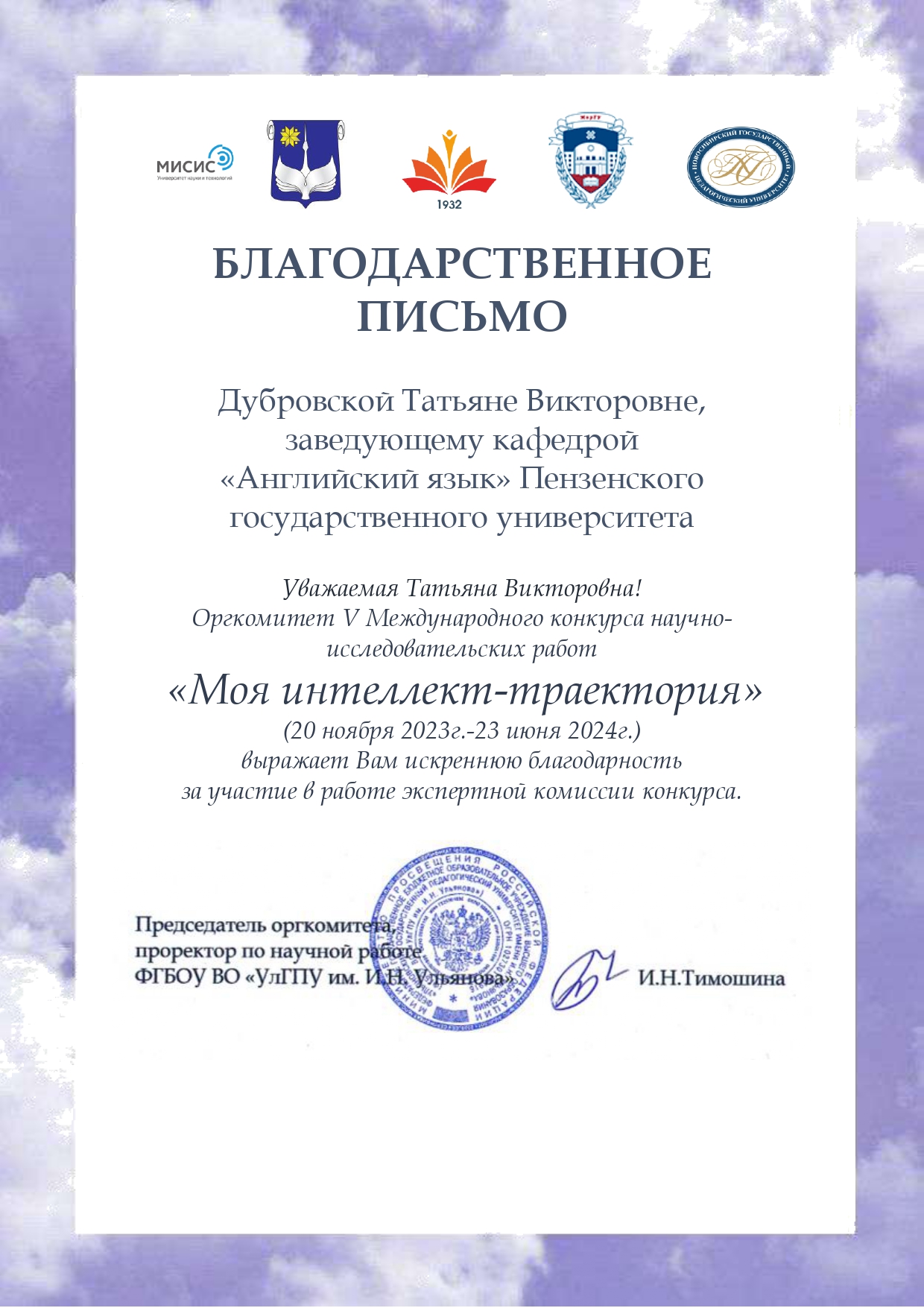 Зав. кафедрой Т.В. Дубровская и доцент кафедры Н.С. Данкова приняли участие в работе экспертной комиссии V Международного конкурса научных работ «Моя интеллект-траектория», который проводился в Ульяновском государственном педагогическом университете имени И.Н. Ульянова с 20 ноября 2023 года по 20 июня 2024 года. Т.В. Дубровская и Н.С. Данкова ежегодно участвуют в конкурсе научных работ, организованном УлПГУ им. И.Н. Ульянова. Конкурс проходил в два этапа. На первом этапе (декабрь 2023 – январь 2024) эксперты рецензировали и оценивали описания проектов участников. Второй этап конкурса проводился в рамках VII Международной молодежной научно-практической конференции «Молодежь и наука: слово, текст, личность» с 18 по 20 апреля 2024 года. Участники представили результаты своих исследований в форме устных докладов и презентаций. Эксперты оценили очные выступления участников в онлайн формате. Т.В. Дубровская, д.филол.н., профессор выступила в качестве члена жюри в секции 6 «Медиалингвистика»,
