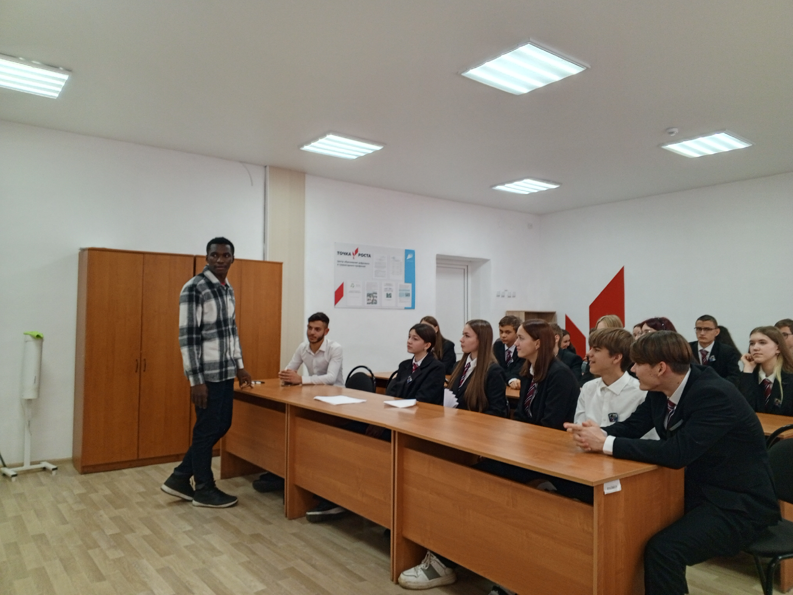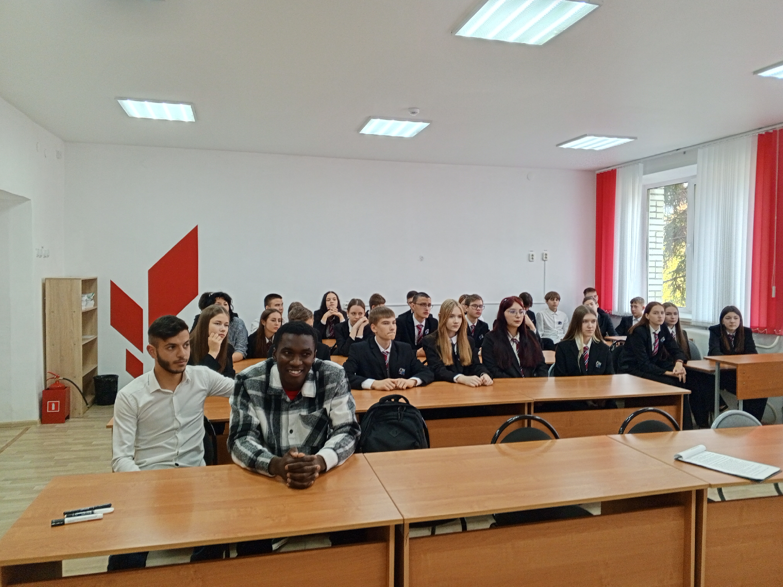 Кроме преподавателей в поездке приняли участие и студенты ПГУ. Иностранные студенты из группы 23ЛЛ15 Эзекил Намолонго (Замбия) и Кусай Ганем (Иордания) рассказали школьникам о своих родных странах и об учебе в ПГУ. Студенты гр. 23ВБ1 Владислав Гущин, Ольга Катышева и Александр Симдянов» провели профориентационные беседы в нескольких классах среднего звена. Темой их выступления была организация внеаудиторной деятельности студентов (спорт, КВН, культурно-просветительные мероприятия и т.п.). Все проведенные мероприятия получили положительный отклик со стороны школьников и учителей МБОУ СОШ № 4.