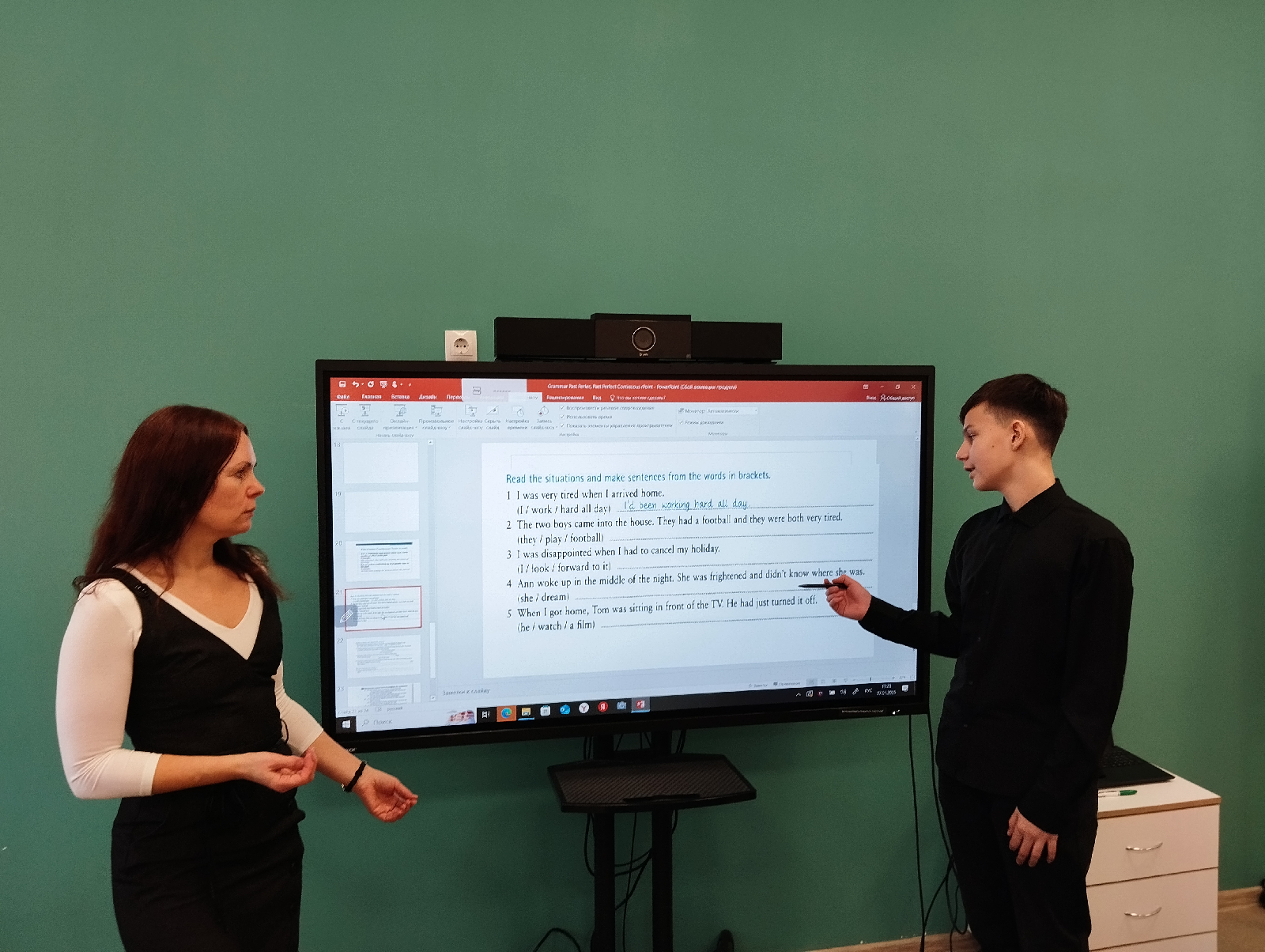 Помимо устного обсуждения, преподаватели предложили учащимся грамматический материал. Ребята познакомились с правилами образования и употребления времен Past Perfect, Past Perfect Continuous. В завершение занятия учащимся была предложена интерактивная игра, нацеленная на употребление данных грамматических времен в речи.