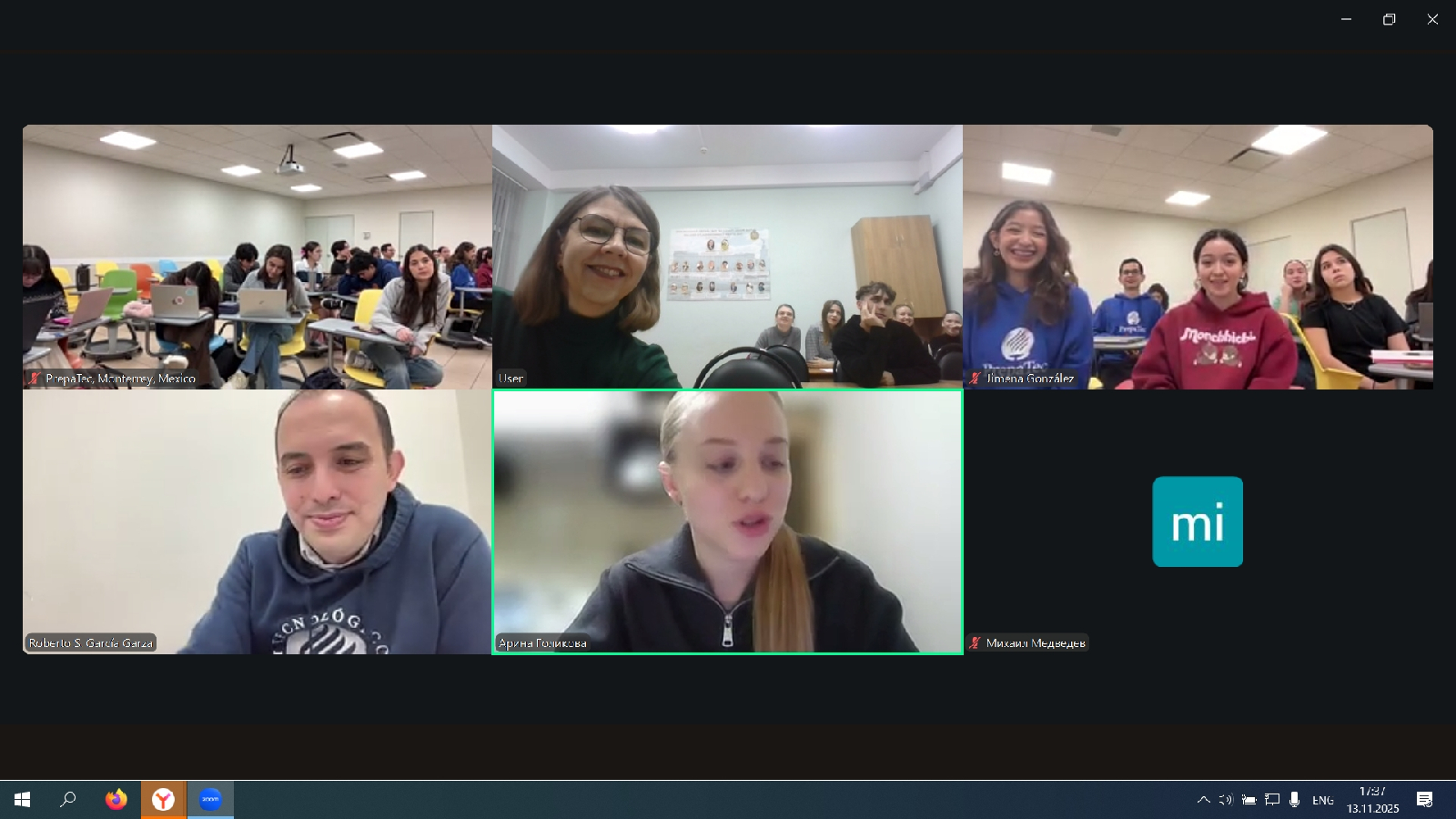 13 ноября 2025 года состоялась вторая онлайн встреча. Участниками стали студенты ПГУ: группы 22ЭА1 и 24ВП1 (преподаватели Дубровская Т.В, Мещерякова Е.А.). Мексиканские старшеклассники вновь собрались под руководством Роберто Гарсия, зав. департаментом по иностранным языкам и социальным наукам.